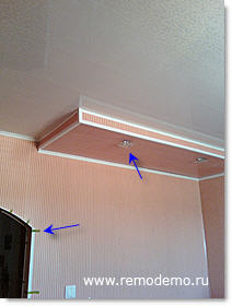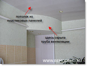 Делаем сначала потолок из пластиковых панелей, а затем небольшой пристрой из гипсокартона, чтобы закрыть вентиляцию.