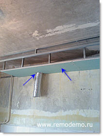 Вырезаем в гипсокартоне участок для воздуховода и крепим гипсокартон к профилям.