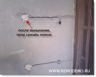 Когда пена высохнет, то срежьте её ножом. Затем зашпаклюйте шпаклёвкой этот участок на два раза.