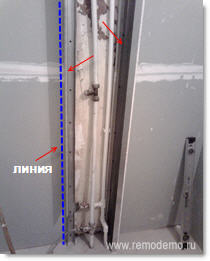 Нам необходимо закрыть трубы в ванной коробом из гипсокартона. Проведите с помощью строительного уровня две вертикальные линии на стене, справа и слева от труб, на расстоянии 3-5 см от них. Прикрепите к стене, с помощью перфоратора, оцинкованный профиль, по линиям.