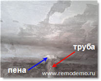 У трубы также промажьте щель грунтовкой и заполните пеной.