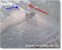 Используя строительный шпатель, зашпаклюйте шов. Желательно шпателем втирать смесь в пену, заполняя все её пустоты.